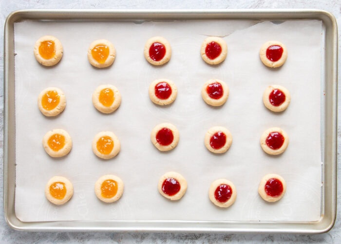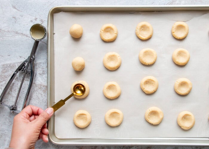 - Roll the dough into balls and make an indent in each using a 1/2 tsp. measuring. Fill the indents with jam using the same 1/2 tsp. measuring spoon.¼ cup jam of choice