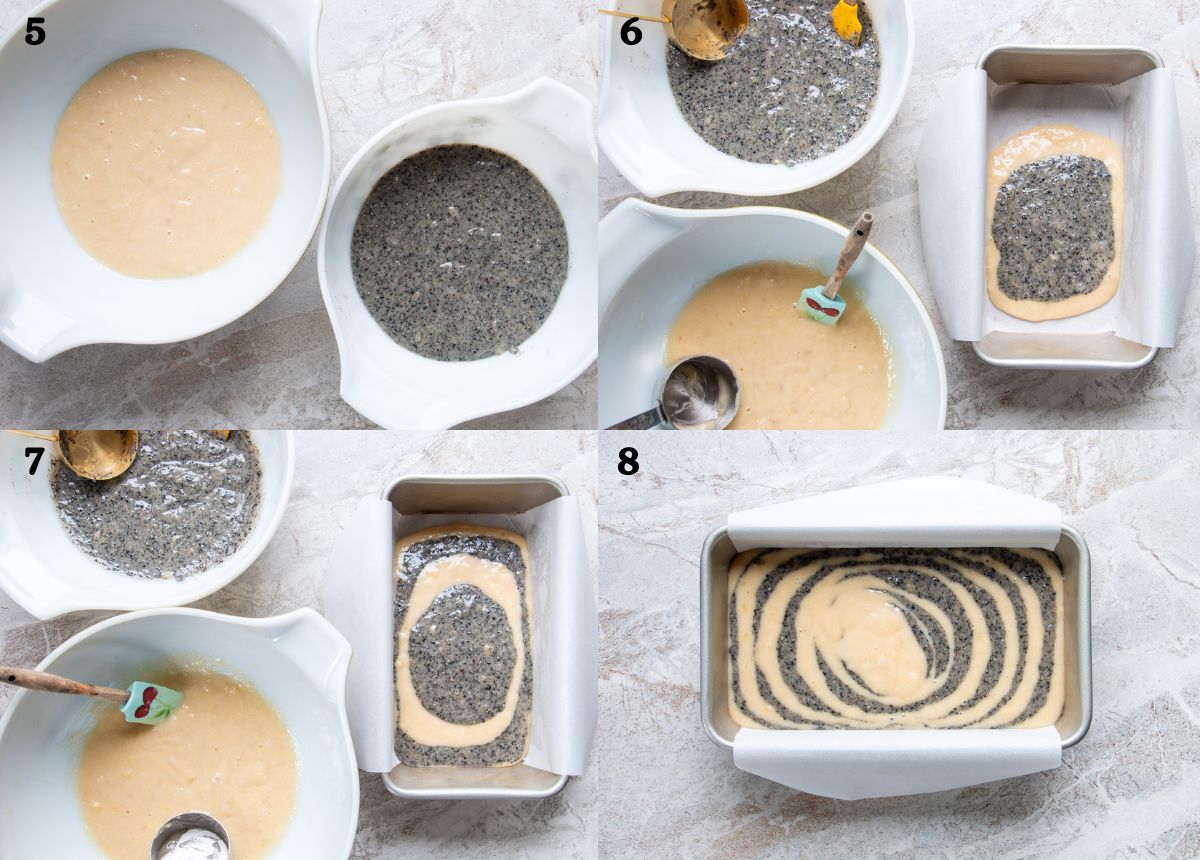 - Dollop a large spoonful of the plain batter into the center of a 9×5″ pan lined with parchment paper. Then dollop a large spoonful of the sesame seed batter right on top. Give the pan a little shake back and forth to help them start spreading out.