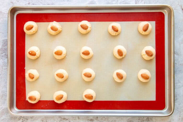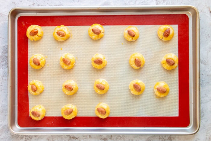 - Gently press an almond in the middle of each cookie dough. Lightly brush each cookie with the remaining egg yolk.about 18 whole almonds for topping, 1 large egg yolk