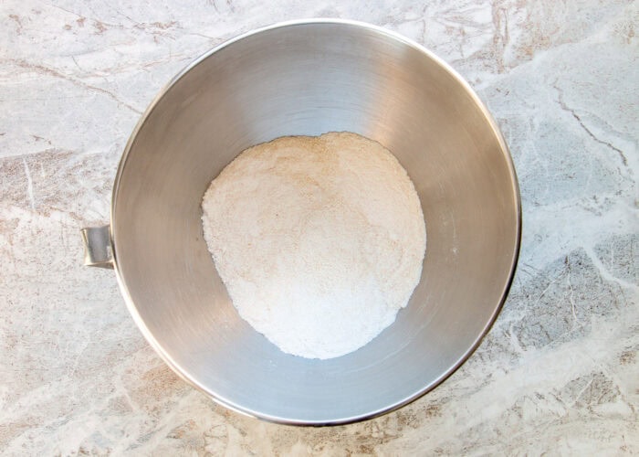 Step #1) In a large mixing bowl, toss together the almond flour, all-purpose flour, sugar, baking powder, baking soda, and salt.