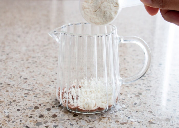 Step #1) Add the cocoa powder and protein powder to a small pitcher or measuring cup.