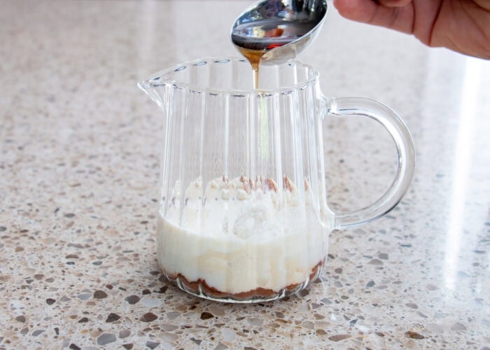 - Add the cream, milk, and maple syrup.2 Tbsp heavy cream, 2 Tbsp milk, 1 Tbsp maple syrup