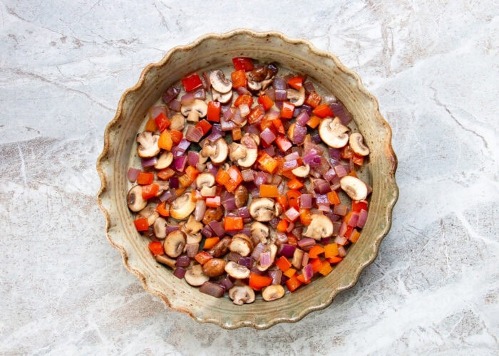 Step #1) Add your cooked vegetables to the bottom of a 9″ round greased dish.