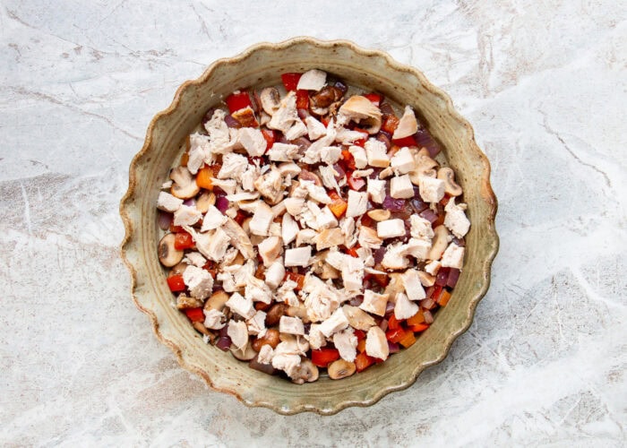 - Add your cooked vegetables to the bottom of the baking dish. Add your turkey or meat of choice on top.1 cup cooked mixed vegetables, 1½ cup cooked meat