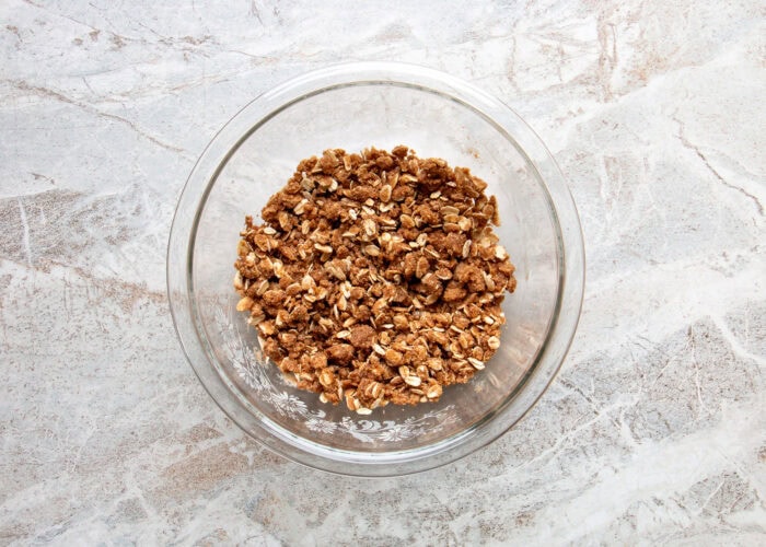 - In a medium mixing bowl, toss together the rolled oats, oat flour, coconut sugar, cinnamon, and salt. Stir in the melted butter until all is moistened.½ cup old fashioned rolled oats, ½ cup oat flour, ¼ cup coconut sugar, ¼ cup melted butter , 1 tsp ground cinnamon, ¼ tsp sea salt