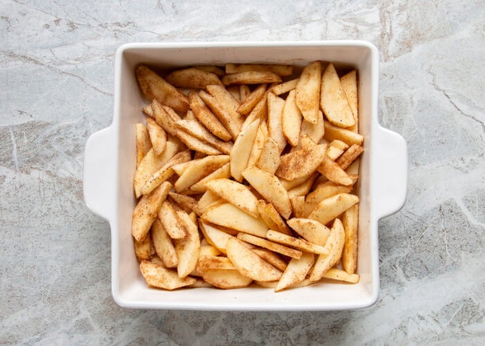 Step #3) In a greased 8×8″ dish, mix the apples with the lemon juice, coconut sugar, and spices.