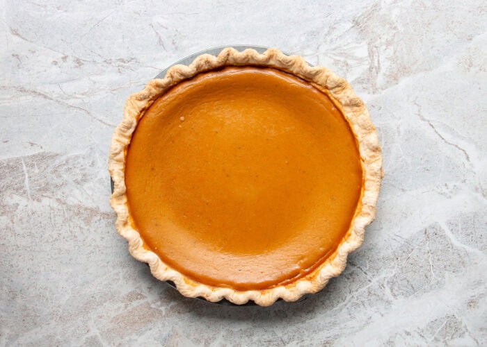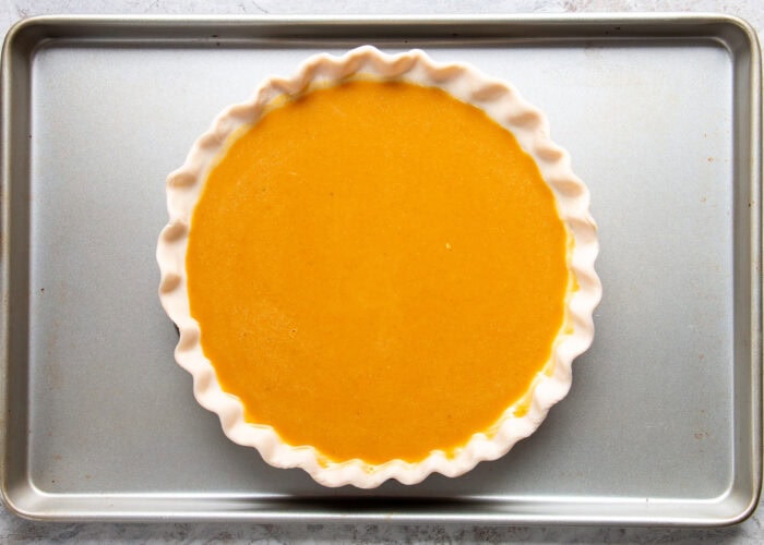 - Pour the pumpkin mixture into the pie crust and place on a baking sheet.