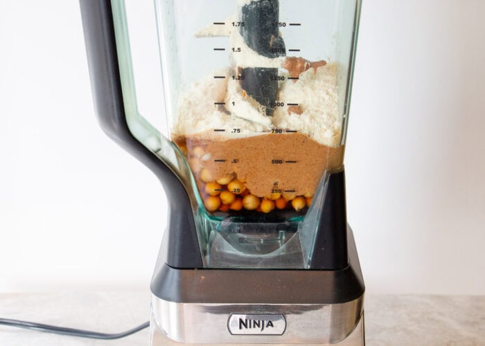 - Add all the ingredients, except the chocolate chips, to a blender.1 ½ cups canned chickpeas, ½ cup natural almond butter, ½ cup almond flour, ½ cup protein powder, ½ cup maple syrup, ¼ cup egg whites, 2 teaspoons vanilla extract, 1 teaspoon baking soda, ¼ teaspoon salt