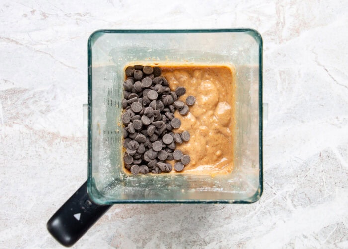 - Remove the blade and stir in the chocolate chips. Pour the batter into the prepared pan. Top with more chocolate chips if desired.½ cup dark chocolate chips