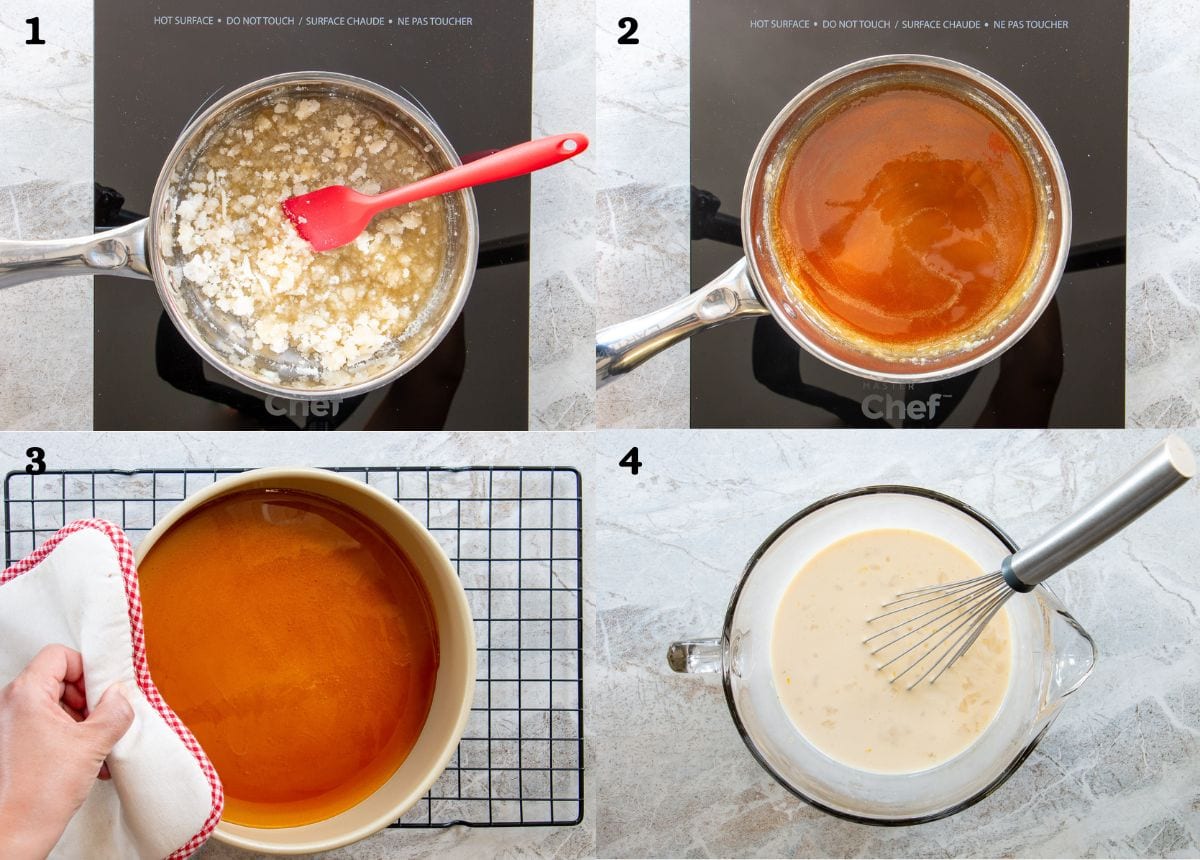 - Heat the sugar in a small saucepan over medium heat. Begin stirring once the sugar starts to melt and reduce the heat to medium-low. Continue stirring until all the sugar has melted and turns golden or amber in color.1 cup (200g) granulated sugar