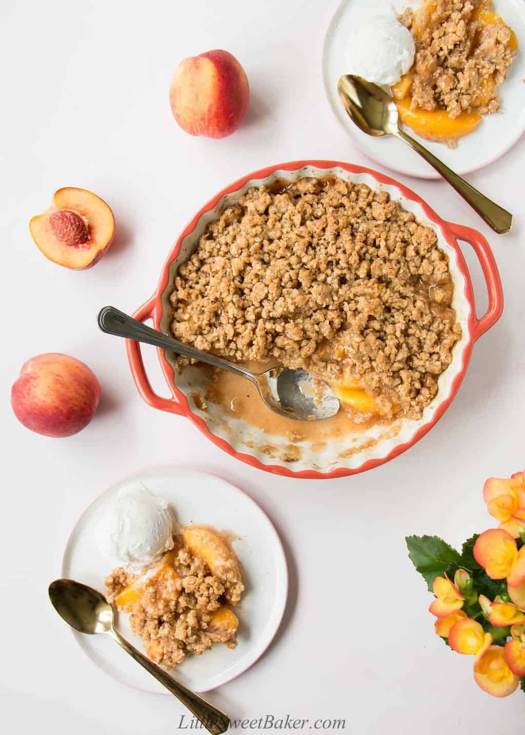 - So much fruit and a thick crumb topping – There are 5 cups of heavenly peaches in this crisp recipe and it’s topped with a thick layer of crumb topping so every bite is a perfect ratio of fruit to crumb topping.