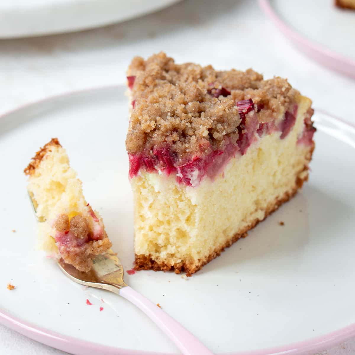 - Streusel – If you don’t want to fuss with the streusel, you can omit it and simply sprinkle 2 tablespoons of sugar on top of the rhubarb before baking to compensate for the sweetness.
