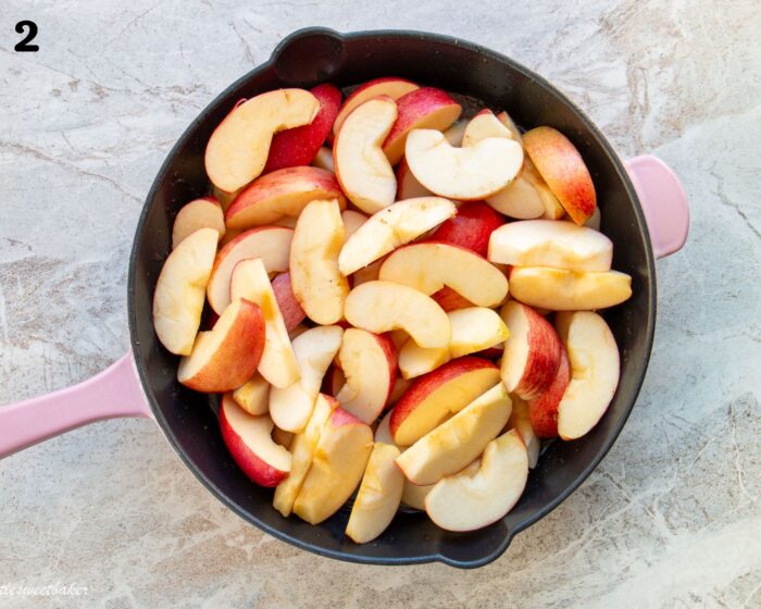 - Add the butter, brown sugar, cinnamon, and salt in a cast iron skillet or heavy-duty frying pan over medium heat, stirring frequently until the butter is melted.1/3 cup (75g) salted butter, 1/2 cup (110g) firmly packed brown sugar, 1 tsp ground cinnamon, 1/8 tsp salt