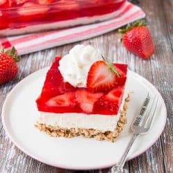It will last for 3 days if properly stored in the fridge. Any longer than that and the crust will start to soften. I’m telling you, if you have never tried this dessert before, you need to. It’s mind-blowing! A crunchy-salty pretzel crust, along with a light and fluffy creamy center, meets a jiggly, sweet and tart strawberry topping. It’s like a flavor and texture explosion in your mouth!