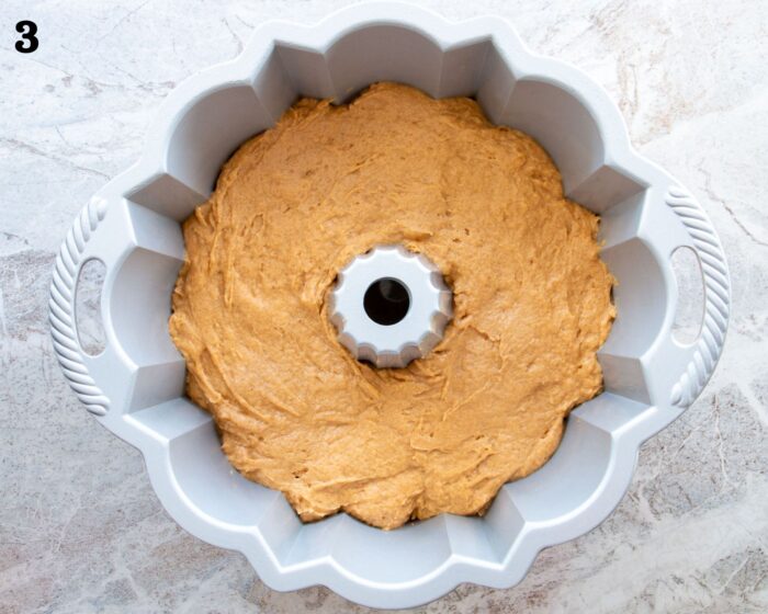 - Preheat oven to 350F. Grease and flour a Bundt pan. Set aside.