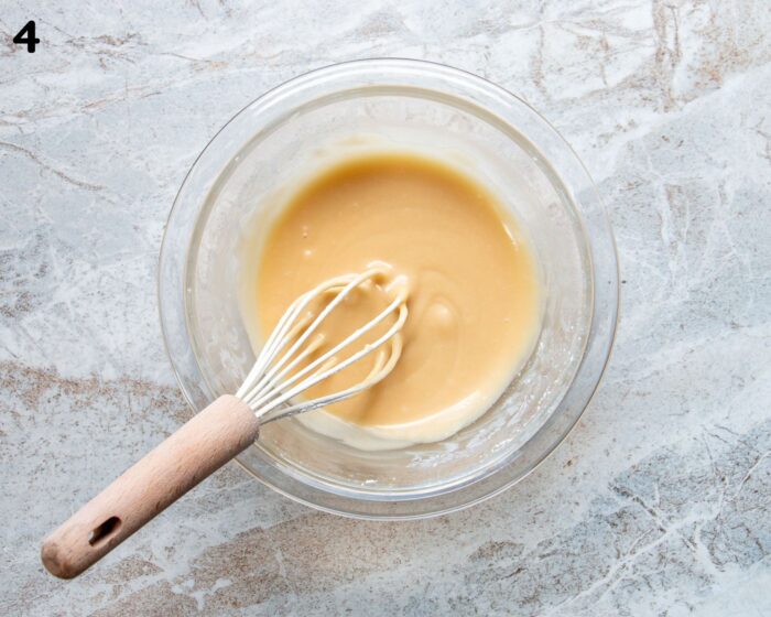 Step #4) In a small bowl, melt the butter, cream, and brown sugar in the microwave for 20-40 seconds. Whisk until combined. Add the powdered sugar and whisk again until smooth. Pour over the cake.