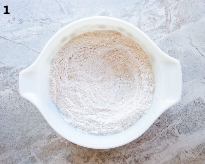 Step #1) In a medium bowl, toss together the flour, baking powder, cinnamon, baking soda, nutmeg, and salt. Set aside.