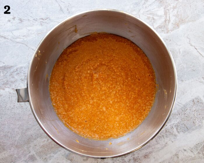 Step #2) In a large bowl, beat the butter and brown sugar until light and fluffy. Mix in the sweet potatoes and vanilla. Add in the eggs, one at a time, mixing well in between.