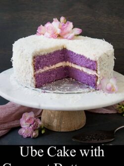 This beautifully vibrant ube cake is soft, moist, and packed with the lovely flavor of purple yam. It’s topped with a coconut cream frosting for a melt-in-your-mouth finish and to enhance the natural flavor of ube.