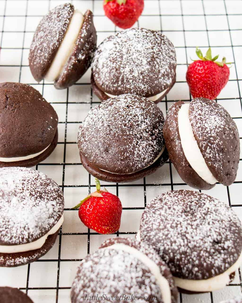 Beat butter, powdered sugar, vanilla, and milk until creamy. Pipe the buttercream on one of the pies and sandwich the other one on top!