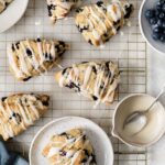 These blueberry scones are buttery, moist and loaded with pockets of jammy blueberries. They are beautifully golden and crunchy on the outside and topped with a sweet vanilla glaze.