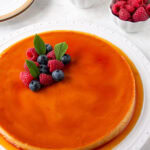 When ready to serve, run a thin knife along the edge. Place a serving plate face-down on top and quickly flip the pan along with the plate over together. Slowly lift the cake pan to release the flan and pour all the caramel over top.